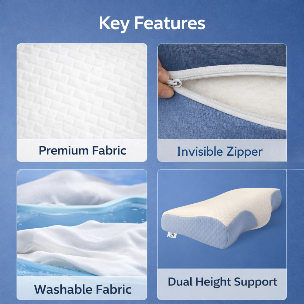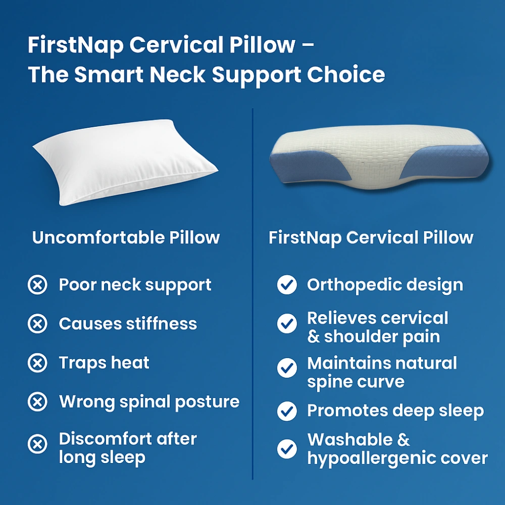 The FirstNap Cervical Support Pillow is specially designed to provide proper neck alignment and enhanced sleeping comfort. Its ergonomic contour gently cradles the head while supporting the natural curve of the neck and shoulders, helping reduce stiffness and promote a more relaxed sleeping posture.