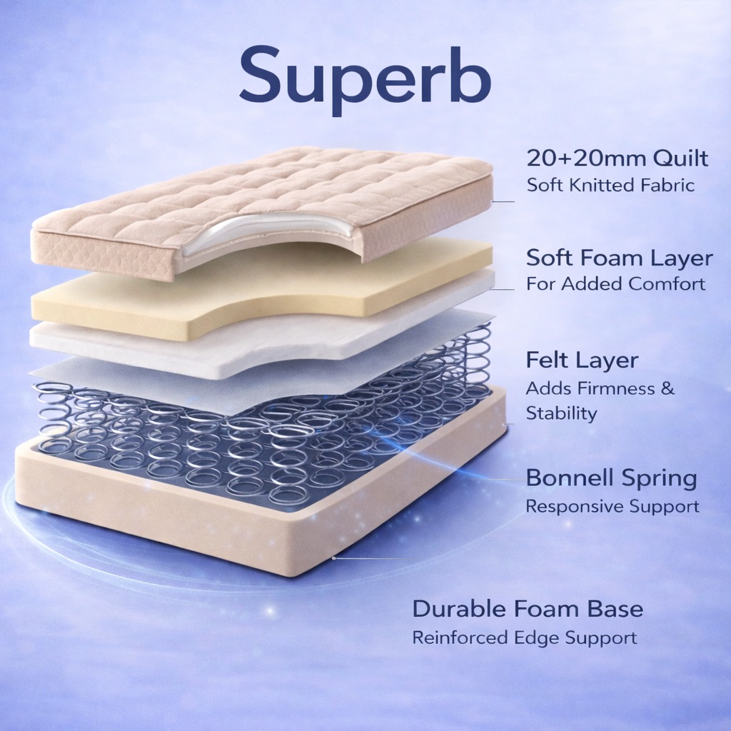 The FirstNap Superb Mattress is engineered to deliver responsive comfort and durable support with its advanced spring construction. The soft knitted quilt top provides a plush sleeping surface, while the soft foam layer adds cushioning for enhanced comfort. The spring coil system ensures balanced support and airflow, while the felt stability layer and durable foam base maintain structure and long-term performance.